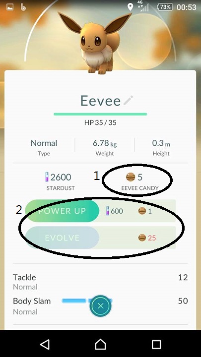 3‧可利用星塵和糖果增加該隻神奇寶貝CP值,圖中 黑圈1 處顯示目前現有的糖果,黑圈2 處為增加能力和進化所需糖果及星塵