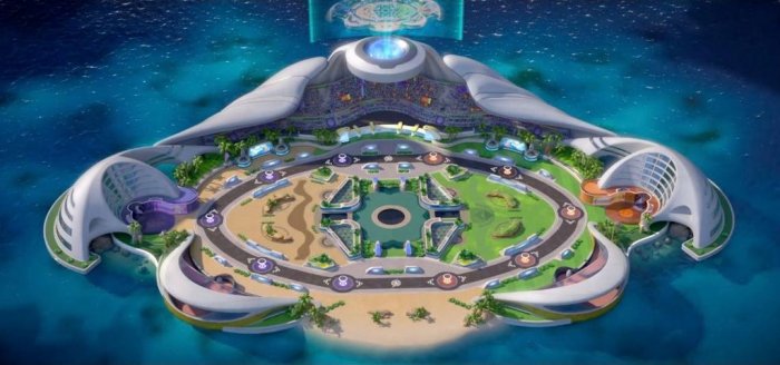 我到現在好像只玩到一張5V5的地圖“黎莫特競技場”?就先聊聊這個吧。黎莫特競技場分為上路、下路和中間區域,是一張軸對稱的鏡像地圖——無論在哪一方,上路和下路都是固定的,地圖左右兩方的資源也是完全一致的。這個設定和王者峽谷的中心對稱有一些區別。
