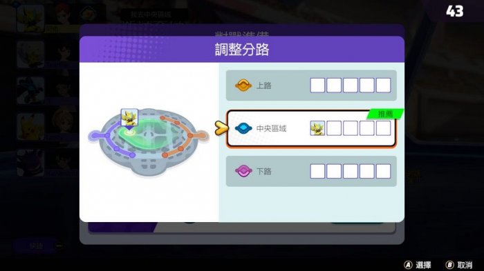 在中路對應的中立寶可夢為閃電鳥,這隻寶可夢被擊敗後,會瞬間破壞所有得分點,最高可能瞬間擁有500分的差距,因此除了中路要注意外,其他路線也應該協助擊殺/防守。