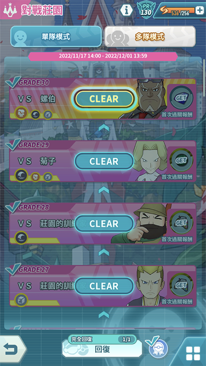 等級設有上限,達到等級上限的拍組將不會再升級,但是進行突破界限可以提升等級上限 單隊模式一共有30個Grade,必須按照先後順序過關,Grade越高難度越大 對戰所消耗的我方HP和招式次數,會沿用到下一場對戰 HP降為0的拍檔組合就不能繼續參加對戰 也會沿用對戰對手的剩餘HP和擊倒狀態,但不會沿用招式次數 最多可帶9對我方的拍檔組合進行挑戰 我方所消耗的HP和招式次數,不會反映至對戰莊園(單隊模式)以外的地方 使用完全回復後,我方拍檔組合的HP和招式次數會完全回復,HP歸0的拍檔組合也會復活。並且可進行編制的拍檔組合數也會重設。「完全回復」的使用次數在每天14:00給予,保留上限只會維持在1次 若在上期舉辦時通過所有Grade,可在當期舉辦時選擇跳至GRADE 4、GRADE 9、GRADE 14或GRADE 19,跳過後可拿到全部所跳過關卡的首次過關報酬,但不能拿到下述Bonus獎勵報酬 通過每五個Grade後,玩家能從以下的Bonus獎勵報酬選擇一個: ‧追加報酬:可以隨機獲得追加的過關報酬 ‧治癒料理:可以獲得能幫拍組回復HP或招式次數的料理 ‧精力料理:可以獲得能幫助對戰的料理 |