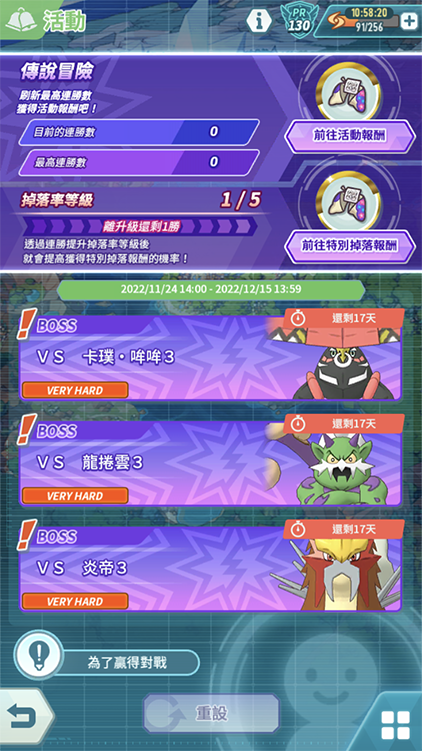 每週星期一 14:00重設,並且對手所使用的寶可夢都可能會改變
