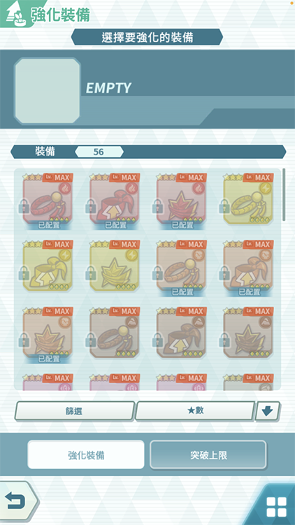 可以為隊伍加上裝備,每個隊伍可以加上手繩、領巾和胸針各1件 幫隊伍加上的裝備會對隊伍的所有拍組分別生效 裝備有屬性之分。當拍組的屬性與裝備的屬性不同時,對於該拍組的裝備效果將會減半(向下取整) 在「強化裝備」中,可使用指定的道具來強化裝備。強化後,裝備的效果會變得更強 在裝備的「突破上限」中,可消耗相同的裝備來提升裝備的等級上限 |