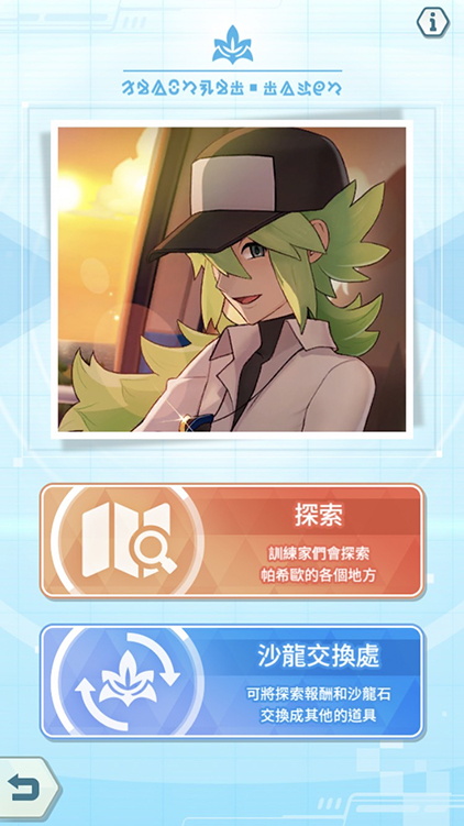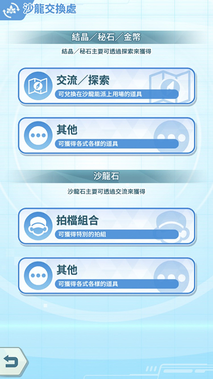 「交流 / 探索」,交換與拍組交流時所用的道具的地方 「其他 (素材)」,這邊比較沒有意義,用途是把沙龍系統收集到的結晶秘石一但滿額99999,花掉並交換突破界限的超級飲料 「拍檔組合」,每當一位沙龍拍組訓練家感情等級100,就可以獲得這位拍組的 4★版本的拍組,之後可以在這裡交換升級拍組招式等級 「其他 (沙龍石)」,用沙龍石交換對戰系統各種升級強化用的素材道具 |