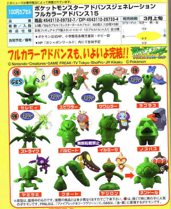 這次出場的有伊布、脫殼忍者、百變怪、鳳王、跳跳豬、鐵面忍者、噗噗豬、洛奇亞、瑪力露麗、瑪力露、露力麗、土居忍士共12種