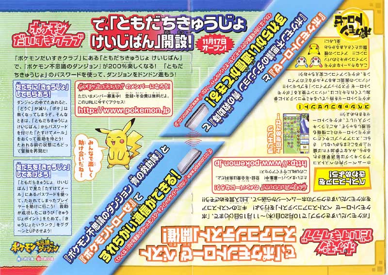 超喜歡寶可夢俱樂部網站、通訊廣場、任天堂首頁、任天堂行動網、全日本寶可夢中心即將聯合為救難隊(藍紅兩版)推出特別救難委託活動,讓你有機會抵達遊戲中隱藏的四個迷宮關卡喔!