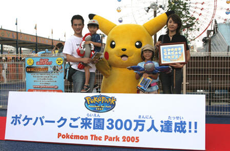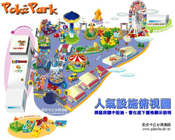 10月28日在愛知萬博裡已經正式討論遊樂園企畫案: Pokemon the Park 2005 場地在名古屋市中村區全面積10公頃的「衛星會場」(ささしまサテライト会場)裡佔地約2公頃,入場純參觀免費(但人氣設施要錢) 消費則是採電子錢幣的方式,會在11/19於JTB連鎖旅行社的窗口販售寶可夢特別電子錢幣卡。 【開幕期間】2005年3月18日~9月25日 【營業時間】上午10點~晚上8點 日方已於日前公佈以下設施名稱,據說會想辦法讓386+1隻寶可夢全數出現 |