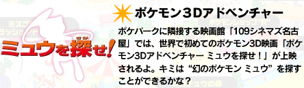 3月18日在名古屋開辦的Pokepark遊園地附近的電影院廣場 ,將會首撥史無前例的寶可夢3D電影「寶可夢3D冒險 尋找夢幻吧!」