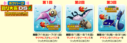 從7月16日至8月31日,「遊樂園釣魚大會DS」(在遊樂園裡可以下載的NDS迷你遊戲)將舉辦夏季挑戰盃,只要在不同期限中釣到指定的寶可夢(限前200名),就可以得到一枚寶可夢遊樂園獨家保護貼,貼在NDS主機上讓自己的NDS更凸顯風格吧!