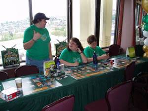 搭乘超高速電梯抵達會場,哇,到處都是一片綠。服務台的裂空綠寶石廣告盒正代表著5月1日的全美發售