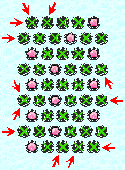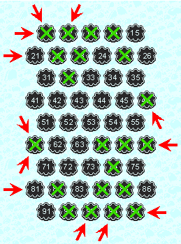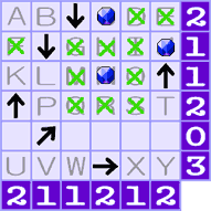 左圖:由於規定「每個箭頭各指向一顆不重複的鑽石」,所以兩個箭頭的交會處就一定沒鑽石的啦!於是先把E和Q打叉,那就立刻知道J有鑽石。把J的橫列和周圍全打叉後,又可知N有鑽石。把周圍的打叉,又N所在的直行恰有兩顆,所以知道C也有鑽石!